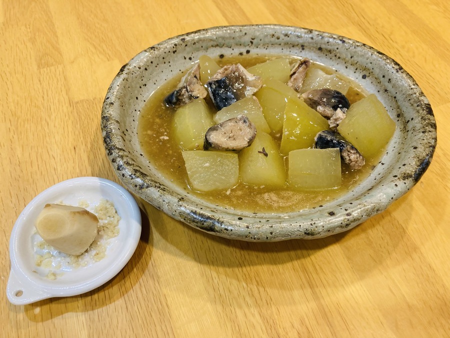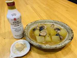 ② ①に鯖缶の缶汁と、淡口醤油大さじ1を入れ、更に5分間落し蓋をして煮ます。