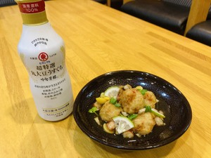 ここに、薄力粉をうすくまぶし、170度の油で4分くらいかけて
