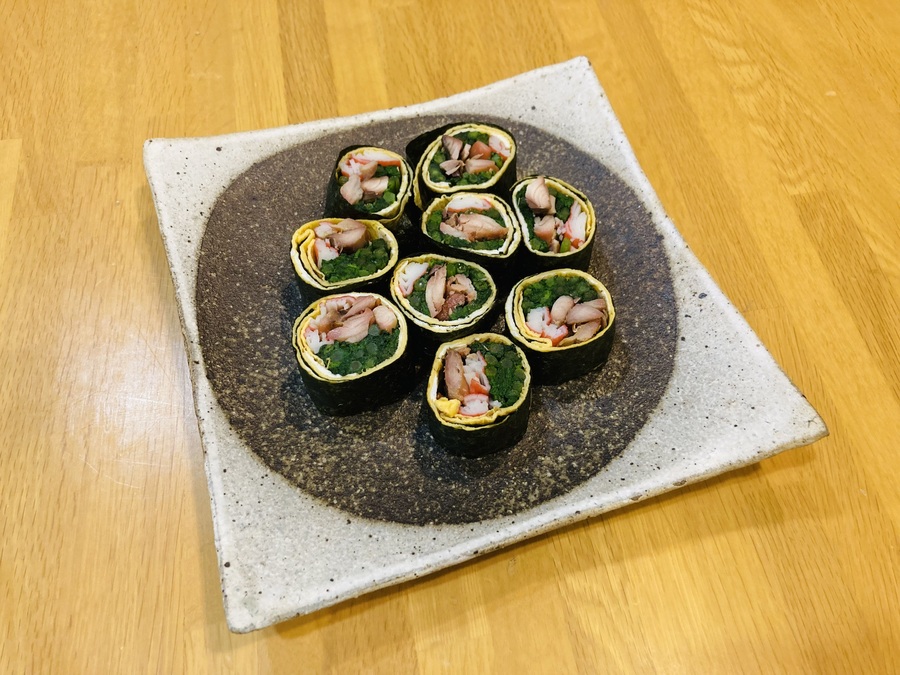⑤まきすに焼のりをのせ、その上に具材を置いていきます。