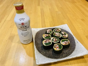 巻き終わりに淡口しょうゆを塗り、のりがはがれないようにします。