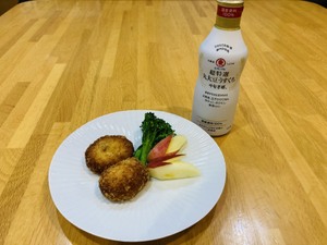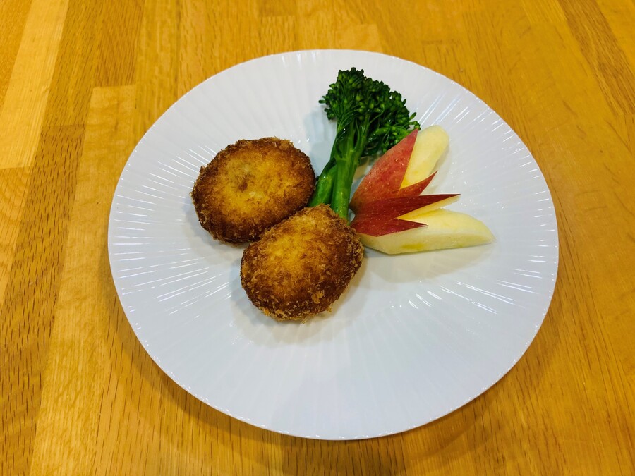 お皿にコロッケを盛り、茹でたブロッコリーとうさぎリンゴを添えれば完成です。