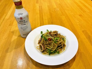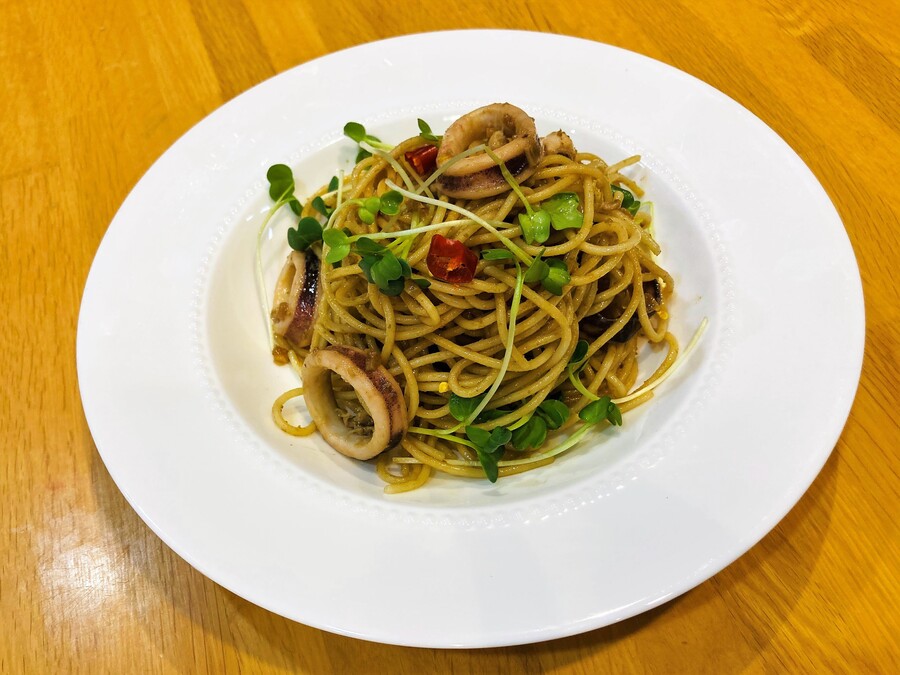 ③のイカわたソースを加え、30秒くらいからめて加熱し、火をとめておきます。