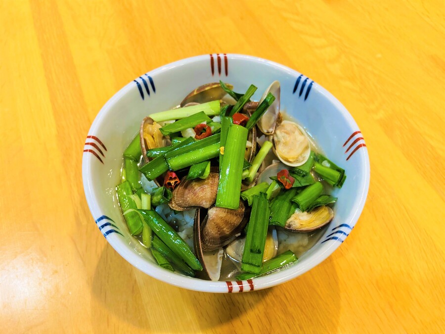 貝の口がぜんぶ開いたら、鶏がらスープの素を小さじ1入れます。