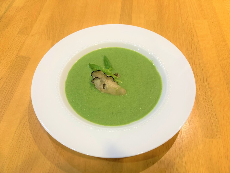 ⑧温めたスープ皿に⑦を盛って②のカキを中央におきます。