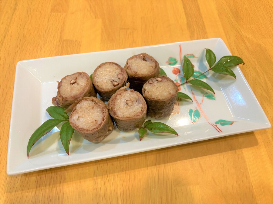 ⑥牛肉を8つに分けて、⑤の小豆ごはんを全体を包み込むようにクルクル巻き、