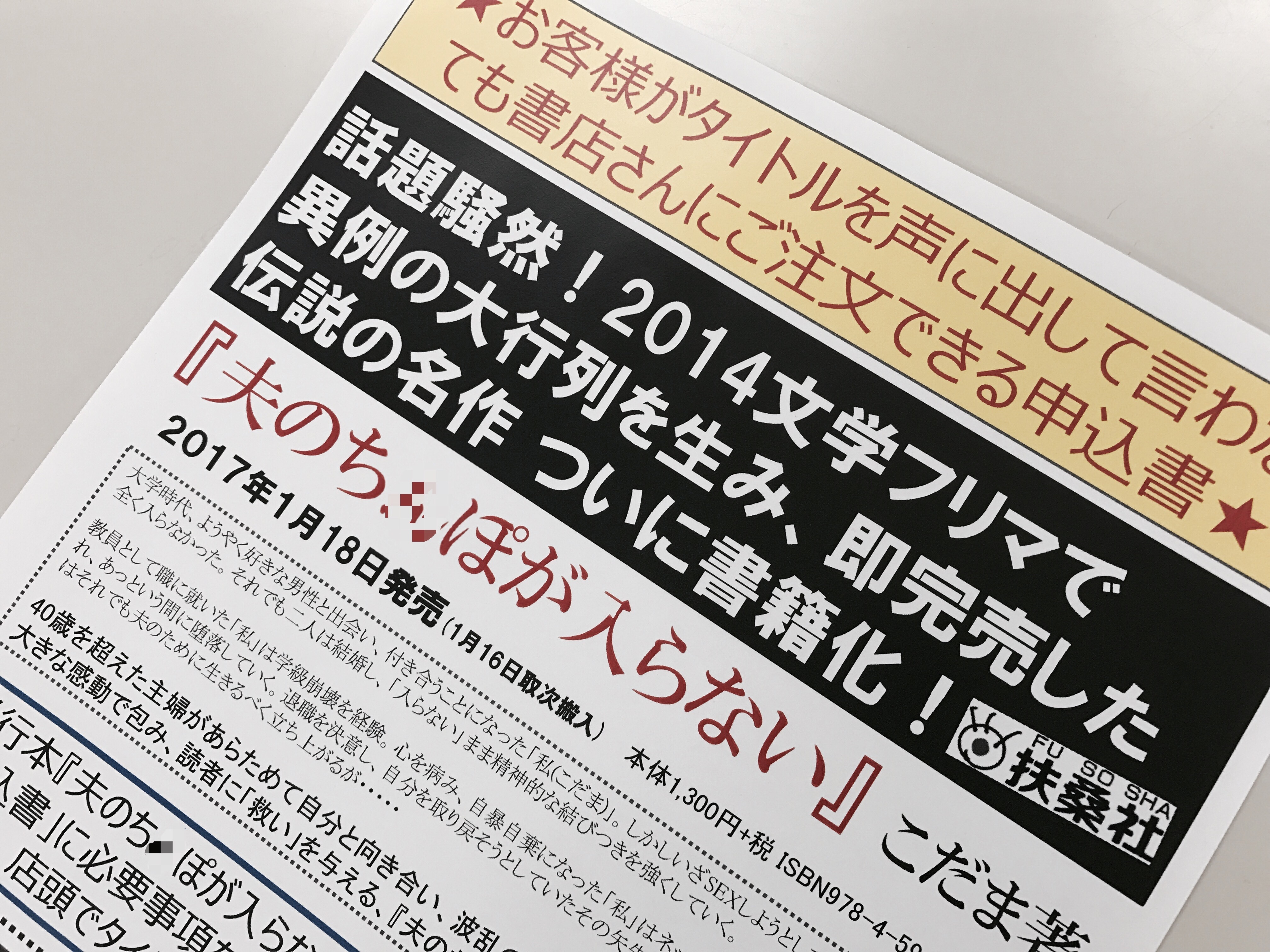 放送禁止ソングの金字塔「金太の大冒険」の作者でもある、あのつボイノリオですら口に出すのが憚られる、というタイトルのため、発行元の扶桑社ではタイトルを声に出して言わなくても書店で注文できる申し込み書を用意しているとか。「むかしコンドームなんかこの指をこうやってやるだけで(お店が)すっと出しますよ、というのがありましたよね」
