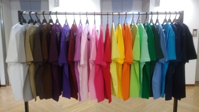 左から、1:ホワイト 4:ライトグレー 7:サンドカーキ 18:チャコール 19:ダークブラウン 15:マットパープル 23:バイオレットパープル 16:バーガンディ 12:ラベンダー 8:ライトピンク 11:ピンク 24:トロピカルピンク 13:レッド 10:ライトイエロー 2:カナリアイエロー 5:オレンジ 6:ライムグリーン 3:メロン 22:グリーン 25:アイビーグリーン 9:サックス 14:ターコイズブルー 17:インディゴ 20:ネイビー 21:ブラック