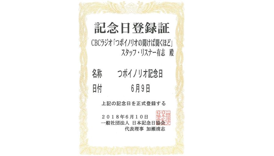 (日本記念日協会への申請書より) CBCラジオで放送中の番組 「つボイノリオの聞けば聞くほど」は、 1993年10月から始まり、今年で25周年を迎えます。 リスナーから毎日寄せられる500通近いお便りを紹介しながら、 ニュース、社会の出来事から家庭内の秘め事まで、 およそ人の生活にまつわることなら何でも取り上げてきました。 もとより、「金太の大冒険」等、“放送禁止曲”といわれた曲を 数多く出してきたシンガーソングライターでもある パーソナリティのつボイノリオは、 かつての深夜放送の帝王として人気を博した人物です。 そのつボイノリオが、平日午前中の番組でありながら、 不潔感のない、クスリと笑える下ネタを交えたトークで 毎日放送しています。 そんなつボイの番組では、大切な二十四節季は「啓蟄」「小満」。 番組の花はクリトリア、番組の魚はアイナメ・・などと、 言葉遊びでリスナーと楽しんでいます。 様々な言葉遊びをしている中で、 つボイとリスナーが最も大切にするラッキーナンバーとなったのが 「69」 日常的に、リスナーが経験した69にまつわる出来事、 例えば「銀行の番号札の番号、お風呂の下駄箱の鍵番号が69だった」や、 「自動車の走行メーターが69000キロを指した」 などを経験したリスナーから、それを報告する便りが多く届きます。 毎年6月9日には、番組に「今日はつボイさんの日ですね」 といった内容の便りが届くようになり、 番組全体がお祝いムードになります。 さらに、ウェブ上の百科事典「Wikipedeia」の 「6月9日」の欄には「ノリオ記念日」が リスナーにより書き込まれています。 奇しくも、番組開始から25周年を迎えると同時に 1949年(4月18日)生まれの つボイノリオが69歳を迎えた今年、 番組を通してパーソナリティのつボイノリオと リスナーが一体となって盛り上がれる 6月9日を「つボイノリオ記念日」 として正式に登録し、 番組とリスナーとの絆を確かめる日にしたいと考え、 今回の申請となりました。 |