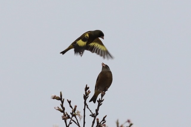 「飛び立った2羽を目で追うと、同じ種類の他の数羽が近くにいて、最初の2羽を交えて、どの鳥がどう組み合わさったかわからない状態になりつつも、まだ第2ラウンド以降続きそうなざわつき。