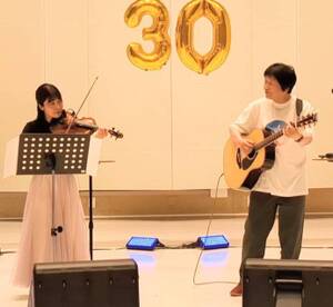 つボイノリオ(番組パーソナリティ)&小西モモ(番組AD兼プロのヴァイオリニスト)のユニット「つもも」。