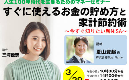 3/29(日)「すぐに使えるお金の貯め方と家計節約術~今すぐ知りたい新NISA~」開催!