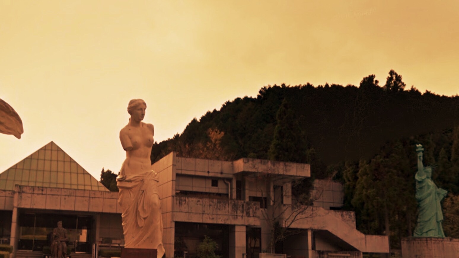 画像には大観音像、そしてたもとにはなぜか巨大なサモトラケのニケとミロのビーナス、さらに自由の女神像が並んでいます。