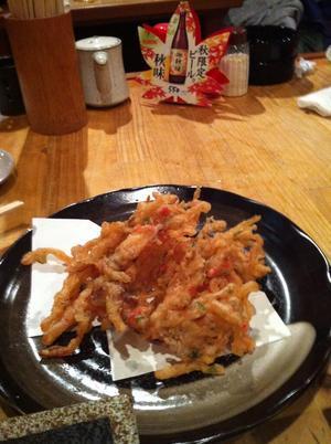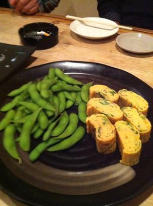 まずはつきだし3種。えだまめ、だしまき、さきイカの青のり天ぷら。