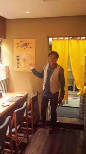 どて家とキリン一番搾りの期間限定のコラボレーションのお店。店内はイエローカラーで統一されていまいsた。