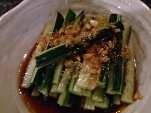 ほそぎりキュウリの塩ニンニクだれ(上)や