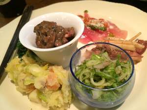 自家製の生ハムとピクルスのサラダに山崎豚のパテ