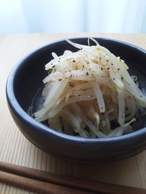 1、熱いうちに鶏ガラスープの素を混ぜないともやしに味がしみないので、熱いですが混ぜて下さい。