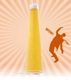 名物の1リットルタワービアは巨大メスシリンダーの中に1リットルのキリン一番搾りが入っていて