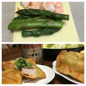 2・ 春巻きの皮に、とろけるチーズを置き、その上に茹でたアスパラと、海老を置いて巻く。
