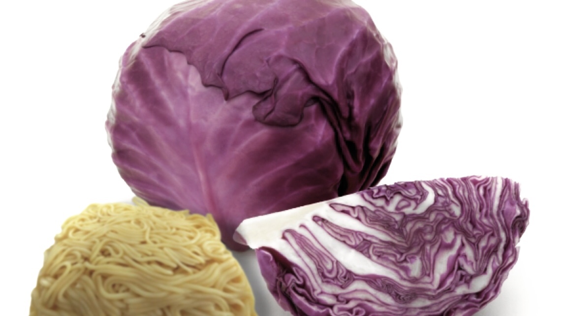紫キャベツと焼きそばを一緒に炒めると、麺は黄色ではなく違う色に変わるのですが、何色になるでしょうか?