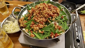 台湾ミンチがドサッとのった、夏でもスカッと気持ちいい汗を流しながら食べられる旨辛のもつ鍋です!!