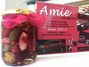 実は細かな気遣いはクルマだけではないんですよ!お客様をお迎えする各テーブルには、今人気のインテリア「ハーバリウム」が「amie」仕様になって飾られています。待っている間に目も楽しませてくれるとは流石です!!