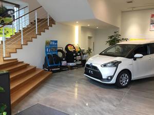 2階建ての1階部分はショールーム。入り口を入ると最新のオススメ車が出迎えてくれます。そして階段を上がっていくとお客様の待合スペースになっています。
