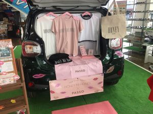 そんな新しいパッソと20~30代女性に支持されるアパレルメーカー「HONEY MI HONEY」がコラボレーションして、ちっちゃな店舗を作っちゃったというのが目玉なんんです!