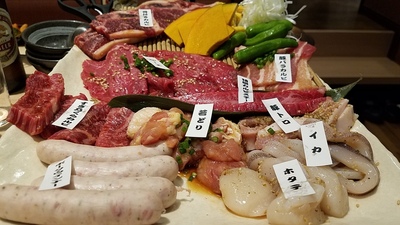 そして、すぎ乃くらカルビ、豚バラカルビ、豚トロ、若鶏、ホタテ、イカ、ウィンナーに、野菜盛り!