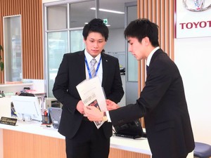 今日、新型プリウスについて教えてくださったのは、岐阜トヨタ 金園店 営業スタッフの山本 智椰さん(写真右)。