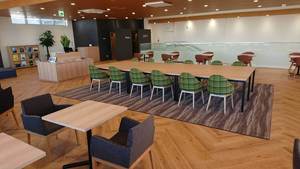2階に上がると風景が一転。1階のシックな雰囲気とは違い、フローリングにカーペットが敷かれ、北欧風の布張りの椅子が置かれアットホームな感じがします。