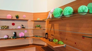 壁の作り棚には、季節に合わせたインテリアが飾られてお客様を迎えてくれます。外からの柔らかい光が差し込んできて、今の季節は特に気持ちがいいですね~。
