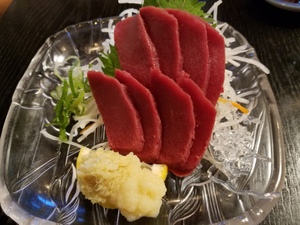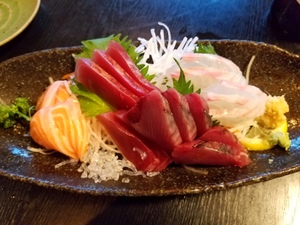 まずは、おススメの刺盛り4種(マグロ・トロサーモン・真鯛・カツオ)