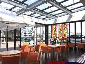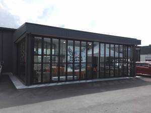 その名も「クリスタルルーム」といって、全面ガラス張りのサンルームのような場所です。(現在はイベント中で机のセットが置いてありますが)通常、こちらのスペースでは展示車を2台おいて、雨の日でも濡れずに、自然の光でボディーカラーを見ていただくことができるようになっています。