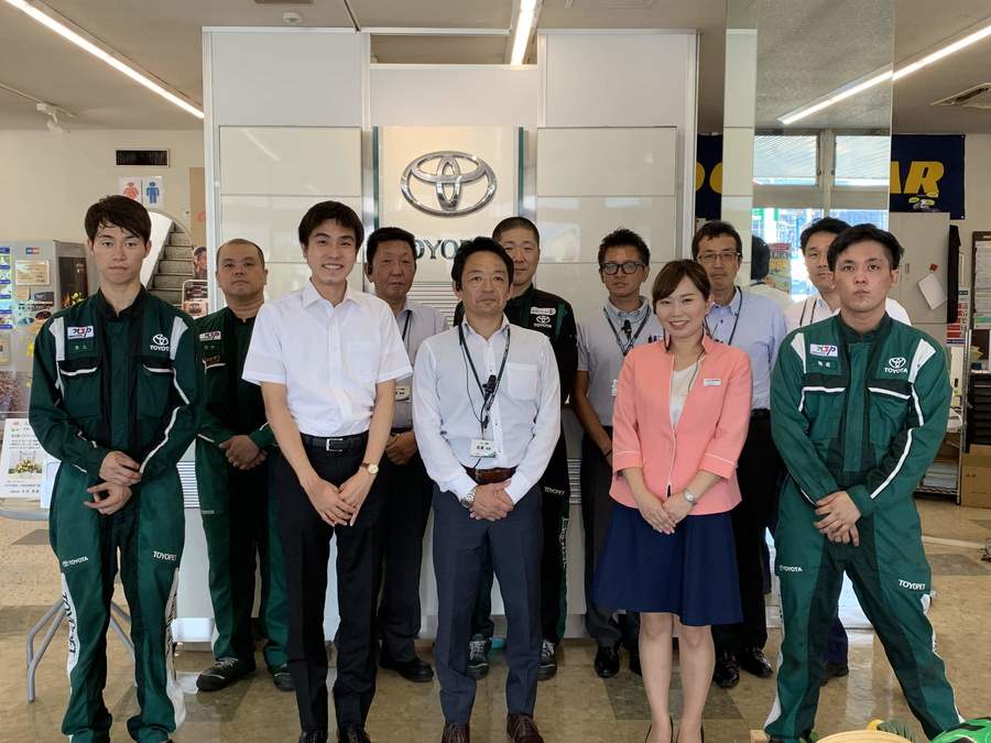 今日は愛知県半田市の半田市役所のすぐ南にあります名古屋トヨペット半田店にお邪魔しました。港が近く、お店の辺りまで海風が吹いてくるのですが、気温も35℃を越えると5分も外にはいられません・・・。そんな中、サービス工場で働くスタッフの皆さんには本当に頭が下がります。