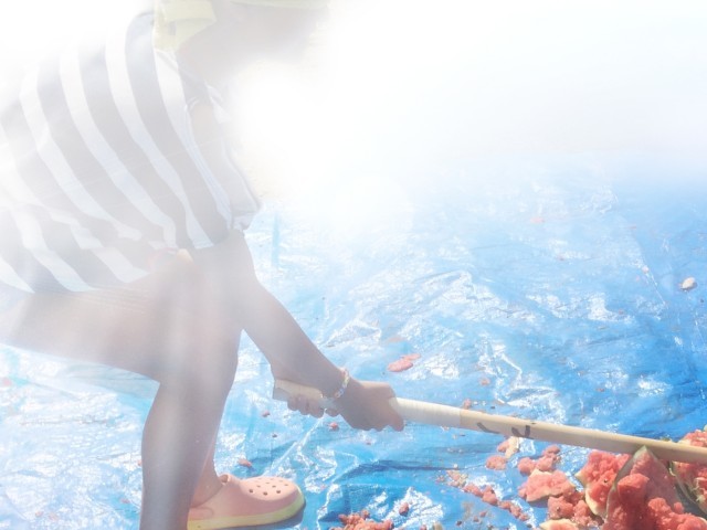 テレビをバンバン壊そうと張り切った工作でしたが、ゴルフクラブをいくら振りかぶっても、なかなかモニターが壊れません。