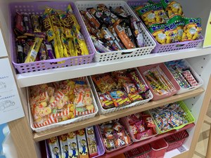 あと、ネッツトヨタ中部のお店の特徴なのが駄菓子のプレゼント!キッズコーナーのすぐ横の棚には、駄菓子屋さんのようにたくさんのお菓子が並べられています。
