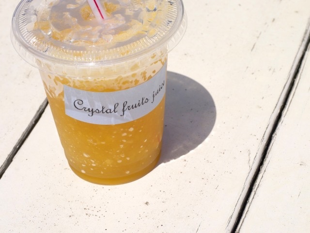 ベースはソーダ風味のゼリー飲料。そこにタピオカ、ナタデココ、ミカン、パイン、白桃ががゴロゴロと入った贅沢なドリンクとのこと。