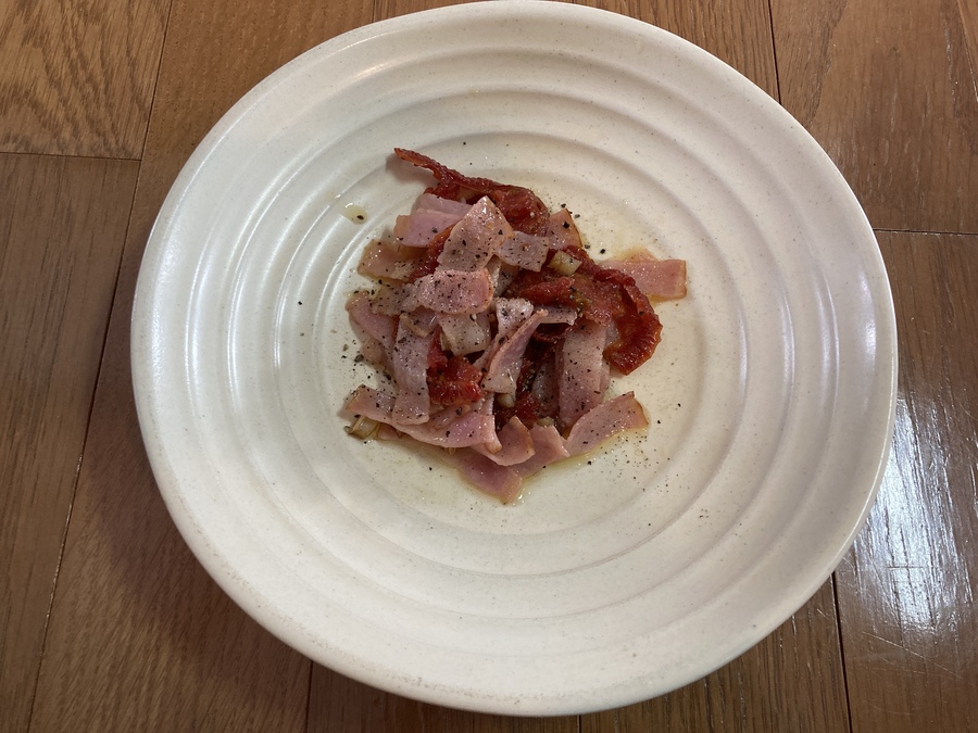 お料理してください。今回は、お湯に3分つけたドライトマトをオリーブオイルと