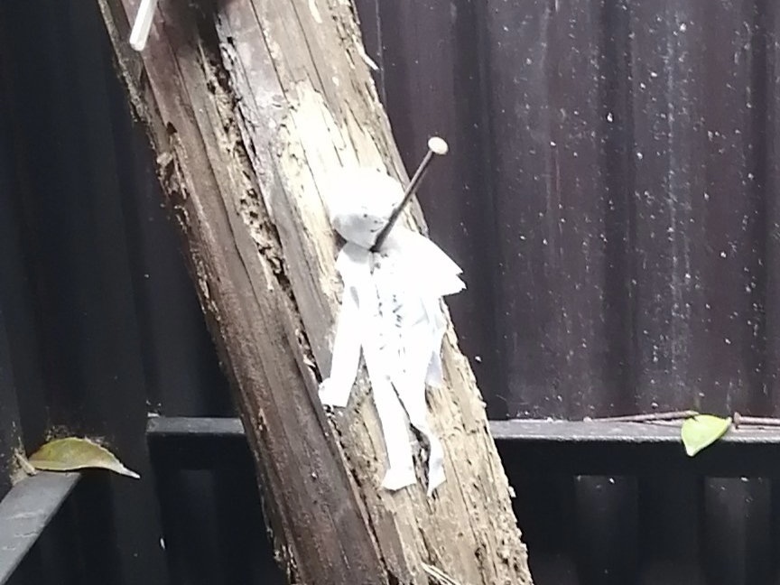 中には丸太が立てかけてあり、恋愛や失踪、死別などが原因で、自分の元からいなくなった人やいなくなりそうな人に対しての苦痛を丸太に釘で打ちつけ、足止めをするのが目的だそうです。