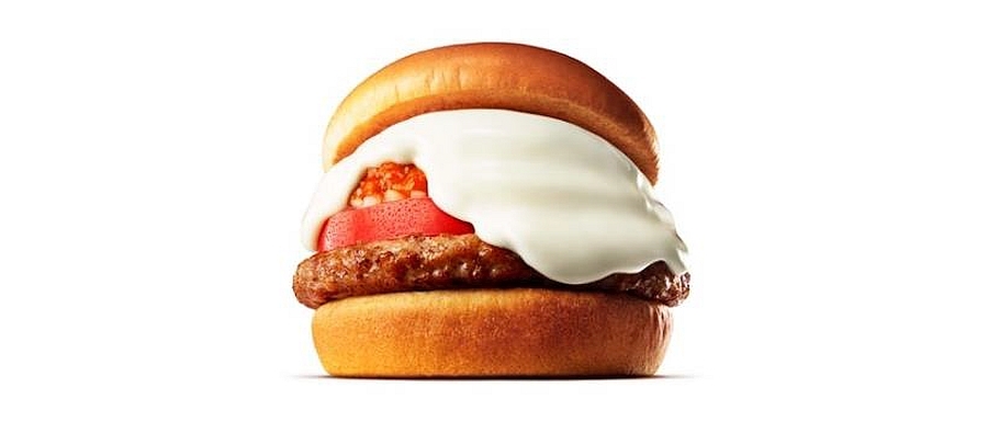 特製のミートソースと輪切りのトマトをマッチさせている「モスバーガー」のアレンジに白いチーズソースをたっぷりと合わせたハンバーガーです。