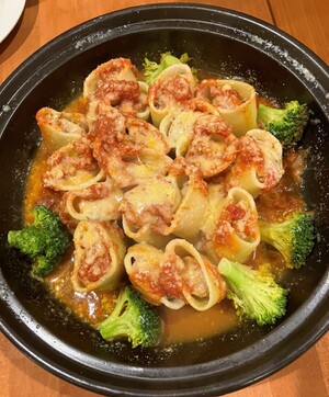 パッケリ(大型のショートパスタに、イタリア風鶏団子を詰めたトマト煮)
