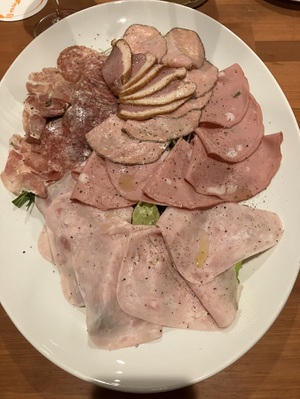 イタリア産ハム、スペイン産生ハム、鴨のスモークなどの前菜盛り合わせ。