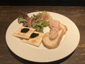 まずシーザーサラダ、キャビア・生ハム・パテの前菜
