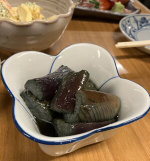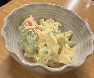 茄子の揚げびたし、ブロッコリーとカニカマのマヨネーズ和え、ピリ辛コンニャク!