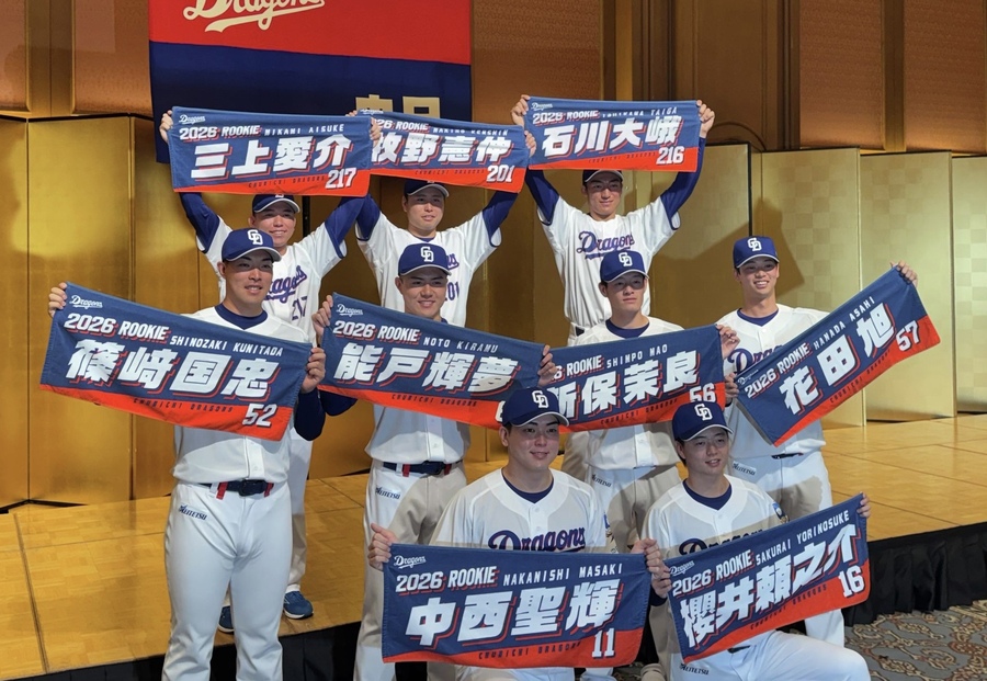 今年ドラゴンズに入団したルーキーは9名。ドラフト1位の中西聖輝投手、2位の櫻井頼之介投手、3位の篠﨑国忠投手、4位の能戸輝夢外野手、5位の新保茉良内野手、6位の花田旭外野手。そして育成では1位の牧野憲伸投手、2位の石川大峨内野手、3位の三上愛介外野手が加わりました。