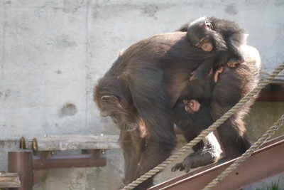 最近では双子が好奇心旺盛になってきて、お母さん以外のチンパンジーとも