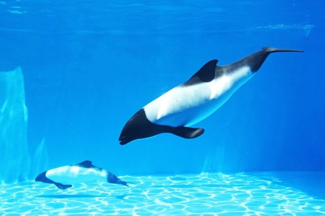 赤ちゃんは白黒ではなく、まだグレーの色になっていて、おかあさんといっしょに泳いでいる姿を見ることができます。