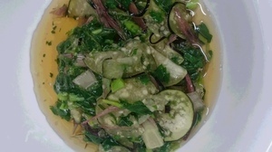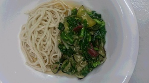 材料:モロヘイヤ・100グラム 茄子・一本 みょうが・一個 梅肉・大さじ1