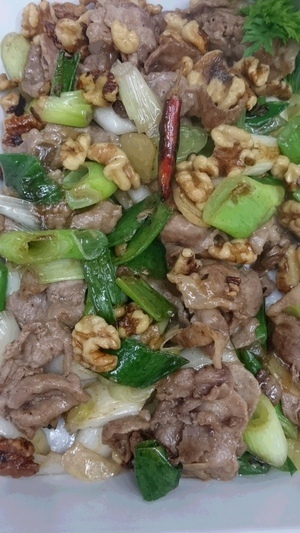 ②にんにく・しょうが・赤唐辛子を炒め豚肉を炒めます。根深ねぎを加え、調味。くるみを加え醤油を入れて調味します。